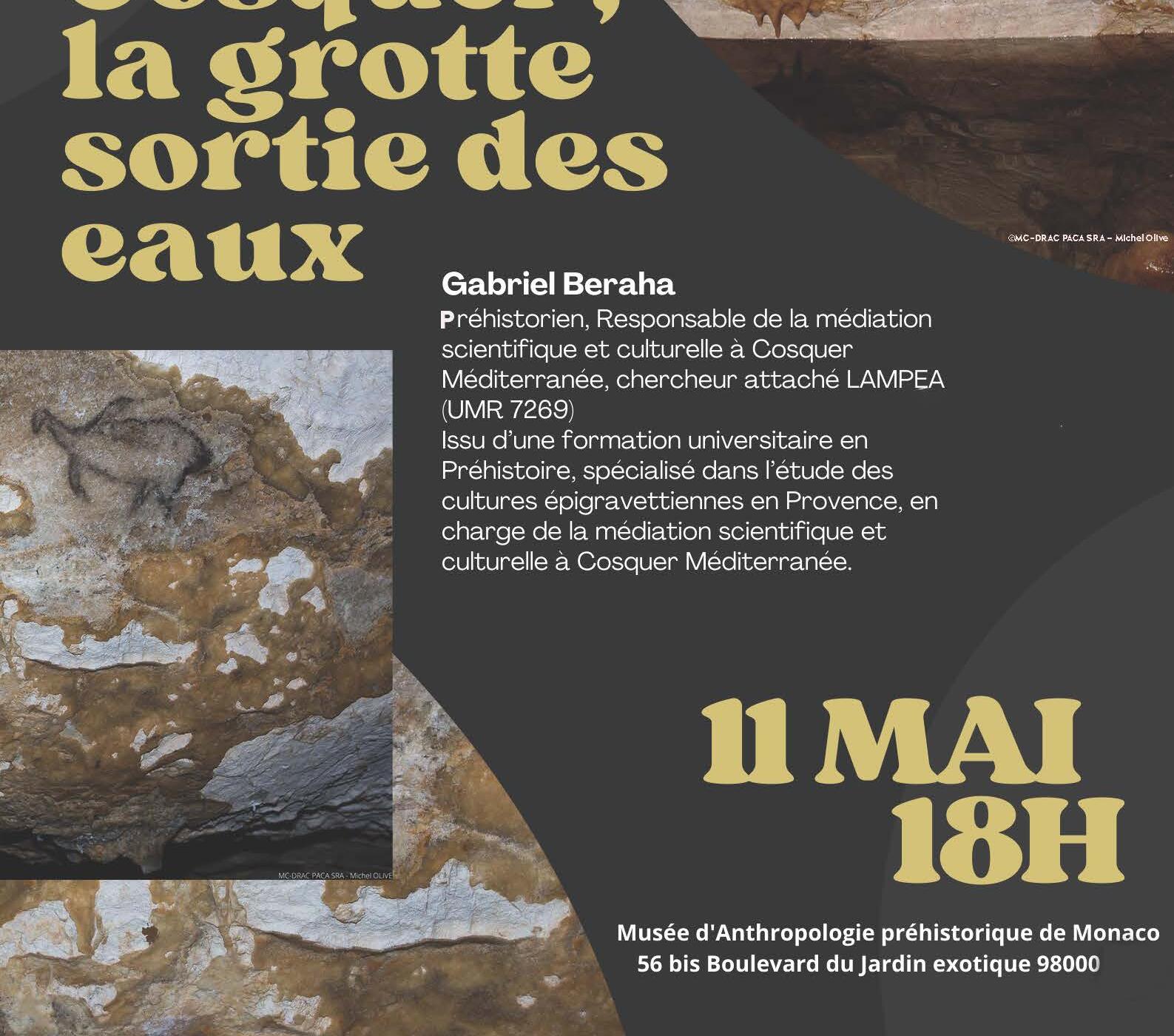 Conférence de Gabriel Baraha, responsable de la médiation scientifique et culturelle à Cosquer Méditerrannée, chercheur attaché LAMPEA (UMR 7269) : "Cosquer, la grotte sortie des eaux" Organisée par l’Association monégasque de Préhistoire. Entrée gratuite/réservation obligatoire – places limitées.