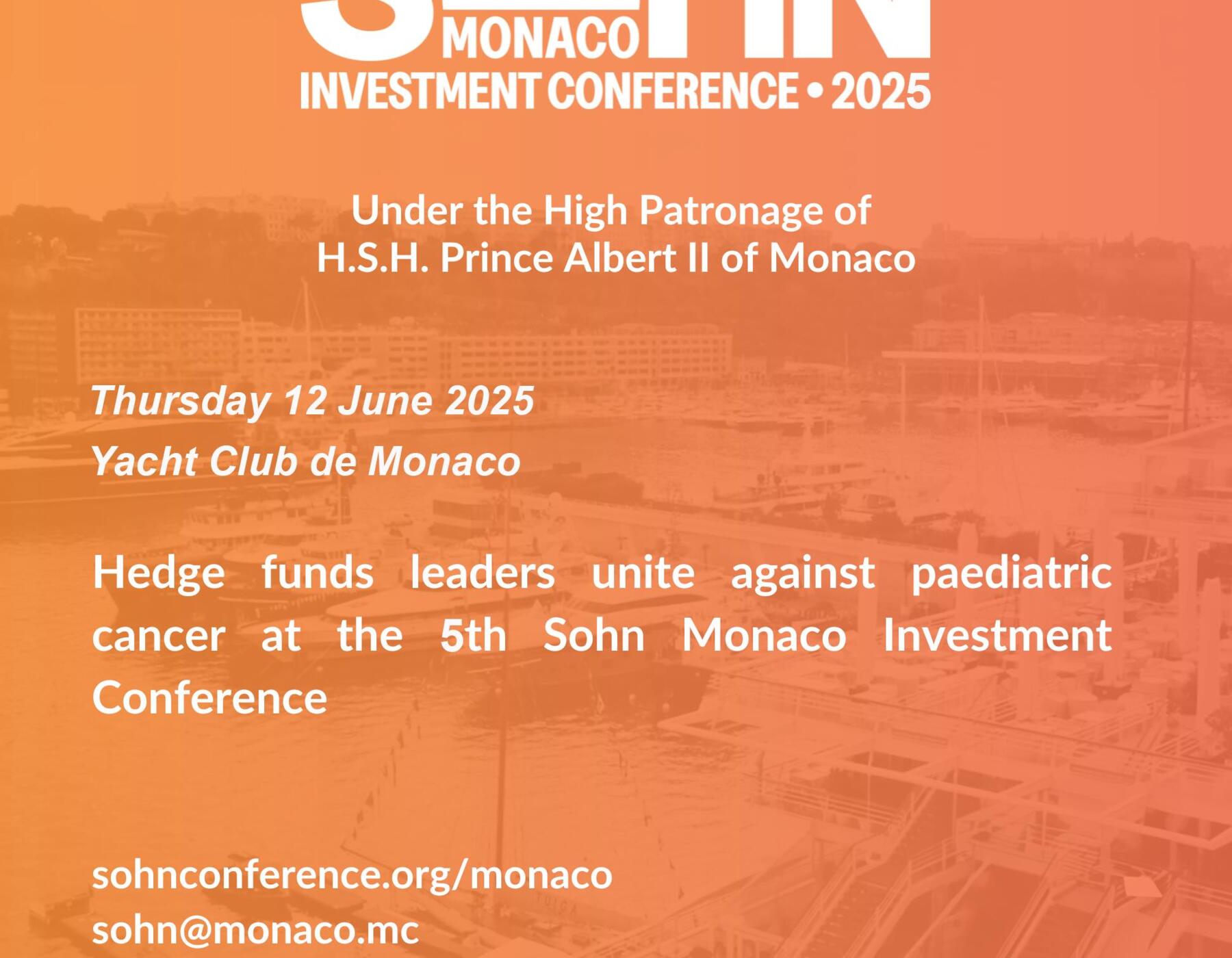 La 5e conférence d'investissement Sohn Monaco se tiendra sous le Haut Patronage de S.A.S. le Prince Albert II de Monaco. Elle réunira les plus grands gestionnaires de fonds spéculatifs d'Europe qui présenteront leurs idées d'investissement, toutes les recettes étant reversées à la recherche et au traitement du cancer pédiatrique. Depuis 1995, la Fondation Sohn, basée à New York, a rassemblé l'industrie financière mondiale pour une journée exaltante d'informations très attendues sur les marchés de la part des meilleurs investisseurs du monde, et soutient la recherche médicale de pointe, l'équipement de recherche de pointe afin d'assurer la survie et le développement des enfants atteints de cancer.