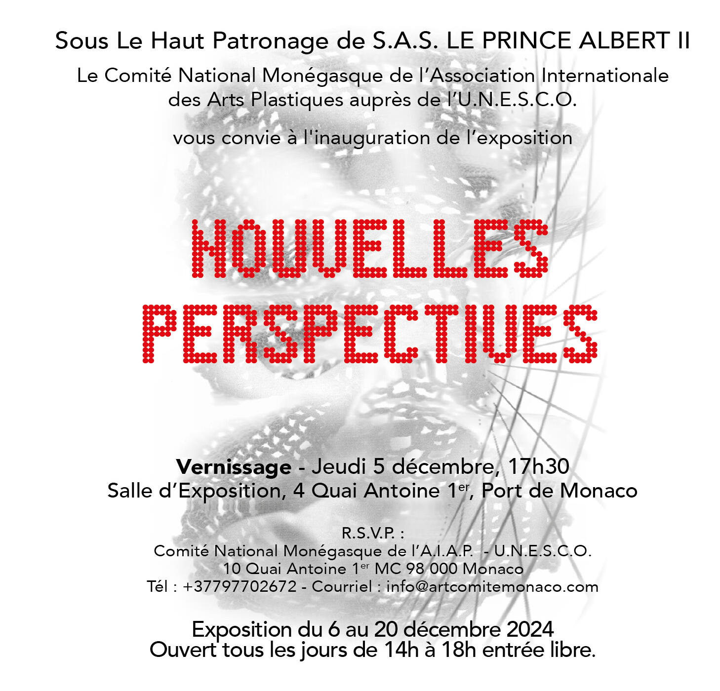Le Salon 2024 présentera une sélection d’œuvres d’artistes membres de notre association au sein de la très belle salle d’exposition du quai Antoine 1er et offrira un espace réservé aux œuvres d’artistes étrangers invités à travers la projection d’une exposition virtuelle en temps réel connectée.